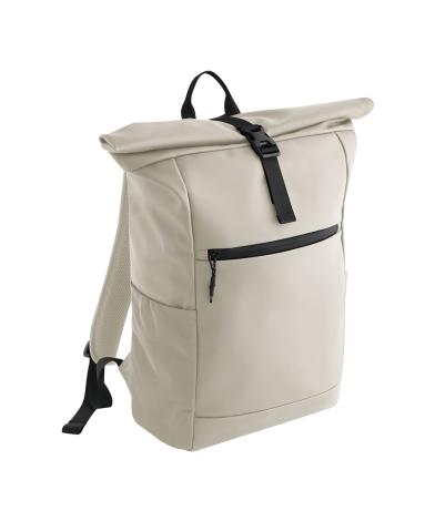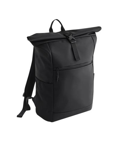 Specification - PVC-free. Minimalist styling. Water-resistant materials. Zipped main compartment. Elasticated mesh side pockets. Internal padded laptop sleeve, compatible up to 16'. Padded back panel. Front pocket with water-resistant zip closure. Secure roll-top and clip closure system. Cord zip pulls with reflective detailing. Padded, adjustable shoulder straps. Grab handle. Tear-away label for ease of rebranding. Lining: 100% Recycled polyester..