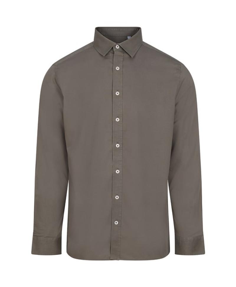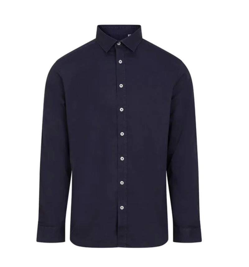 Specification - Regular fitting casual shirt with garment wash for subtle distressed look. Peached finish on fabric. Made from 100% organic cotton. Contrast pearlised buttons on the centre front and cuffs. Adjustable cuffs. Back yoke. Centre back box pleat. Outer hanging loop. Tag-free for easy rebranding..