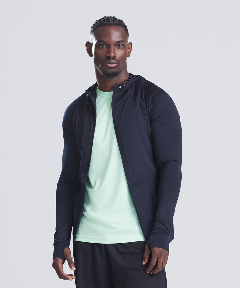 Specification - Sports zoodie with adjustable drawcords hood, raglan sleeves with thumb holes and full-front zip. Contrast fabric on sleeves and body..