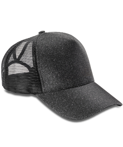 Specification - 5-panel cap (4 mesh/1 fabric). Sparkle fabric stiffened front panel and peak. Mesh back with ponytail hole. Tear-release adjuster. Semi-curved fabric peak made from plastic. Tear-away label..