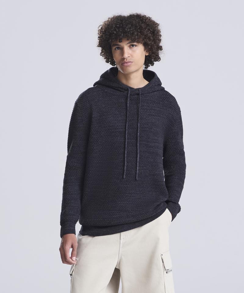 Specification - Chunky tuck stitch knitted hoodie made from regenerated yarn. Featured hood with drawcords, rib at cuffs and hem and two-tone yarn..