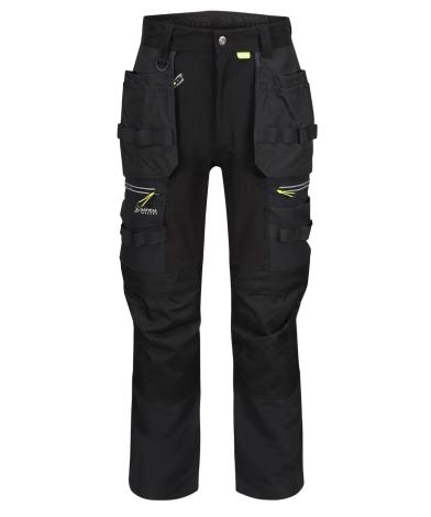 Specification - Woven stretch softshell fabric. Ripstop stretch fabric to outer thigh, lower leg, and seat panels. Durable water-repellent finish. Wind-resistant. Cordura top-loading knee pad pockets. Reinforced seams with triple stitching. Reinforced crotch seam. Easily accessible foldaway 'Holster' pockets with multiple compartments. Multi-function tool and mobile phone pockets on legs, two front pockets, two rear pockets. Shaped high back waistband for comfort. Inner anti-slip waistband print. Reflective piping to the rear of the legs. Slim fit design. Belt loops. D-ring attachment. Reinforced hem overlays. Made using recycled materials..