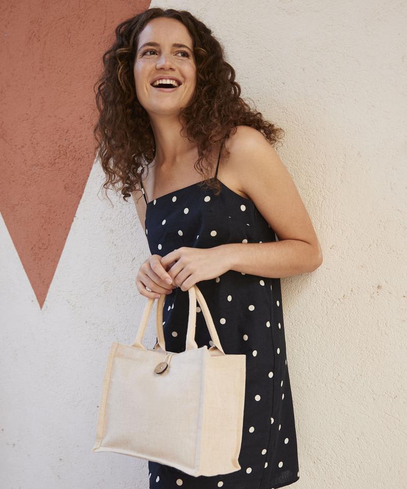 Specification - Refined Jute/Cotton blend for ease of decoration. Cotton carry handles. Handle length: 35 cm..