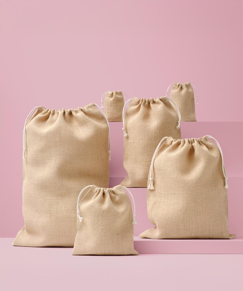 Specification - 100% Jute, 300gsm. Double drawcord closure. Natural ties..