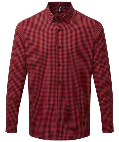 An attractive long sleeve gingham patterned shirt in strong contrast colours. Featuring a single buttoned cuff and sleeve guard. Styled with a narrow soft collar with button down options on the underside. An easycare and durable men's chequered shirt that gives a charming, vintage-chic approach to front-of-house service..