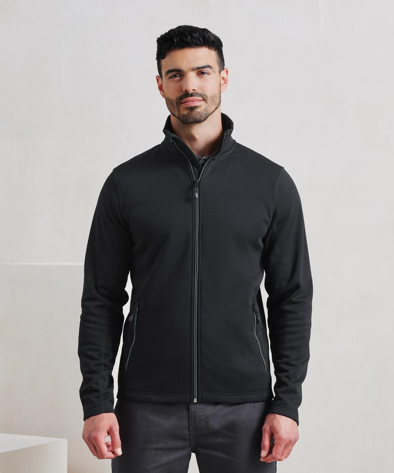 Mens zip-through sweat made with spun dyed certified recycled polyester yarns, a fabric with less impact for a corporate-casual solution. Styled with a fashionable cadet collar and a contrast coloured zip with zip pull. Two external side pockets bear the same zip styling, for a uniform look. Finished with top stitching for a pleasing design feature..