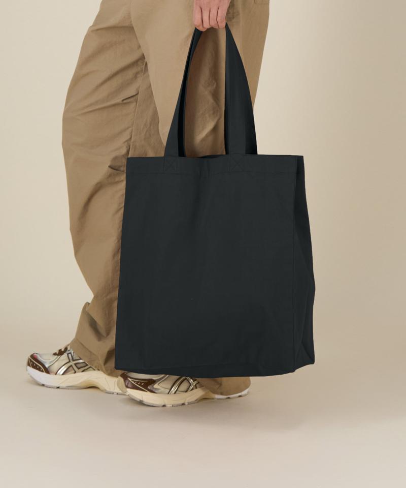 Specification - Midweight tote bag. Folded hem at top edge. Bottom and side souffl. Long self-fabric handles with cross-stitch for reinforcement. Inside self-fabric pocket. Single-needle stitch at top edge..