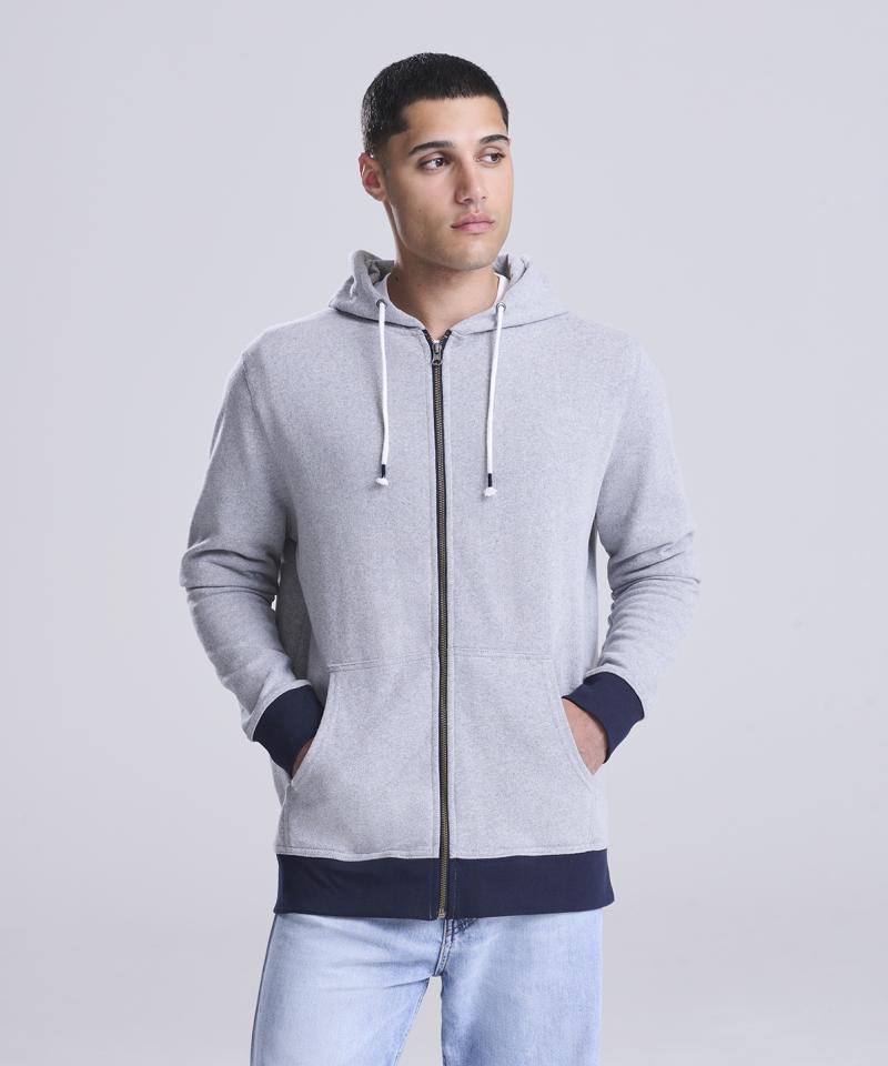 Specification - Long sleeve regenerated cotton zoodie with brushed inner and peached outer face. Features include set-in sleeves, contrast rib at cuffs hem, full length front zip and kangaroo pocket..