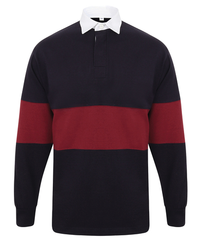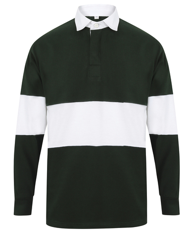 Specification - Tag free retro fit rugby shirt. Cut and sew contrast stripe panel around centre. Heavyweight single Jersey. Contrast traditional woven (twill) rugby collar. Herringbone back neck tape. Contrast herringbone taped side vents. Taped shoulders. Elastane reinforced ribbed cuffs for shape retention. Twin-needle hem. Topstitching at armholes and panels. Concealed button placket. Herringbone inner placket. 2 x rubber buttons. WRAP certified..
