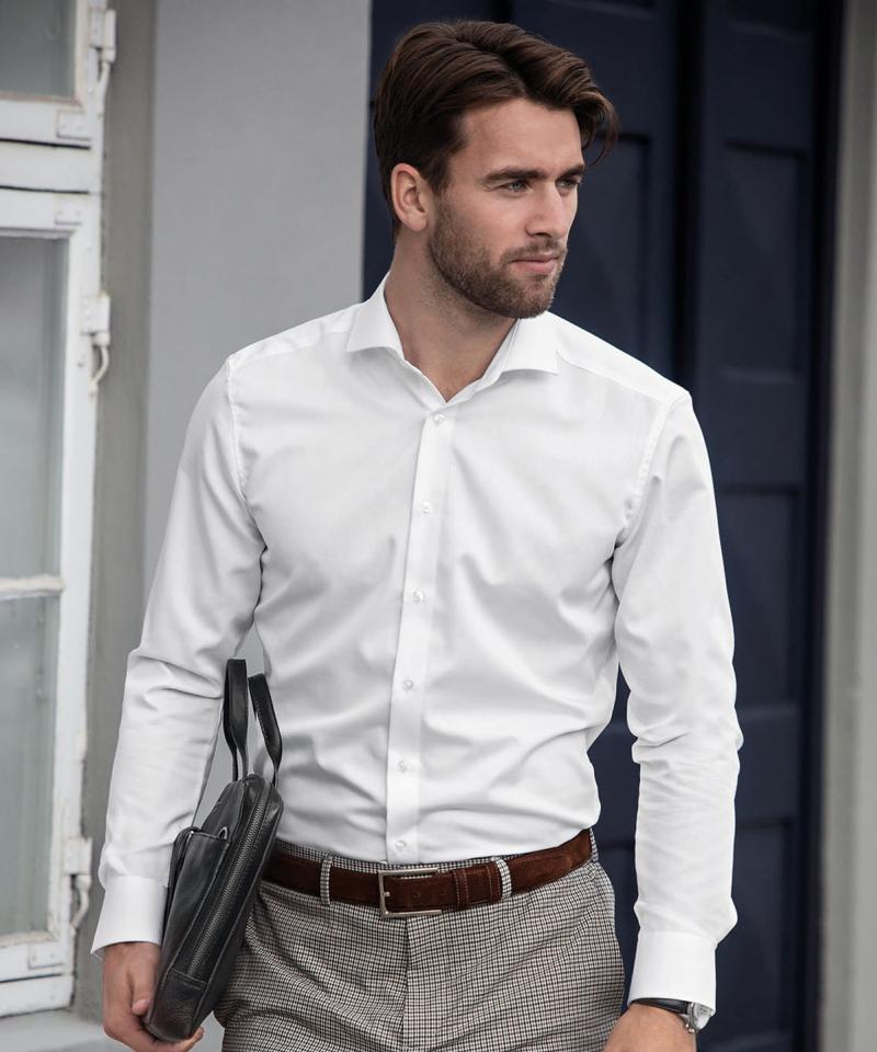 Designed to keep you sharp throughout the day, the Portland non-iron business shirt is crafted from advanced cotton, providing a comfortable fit in a contemporary design. This elegant, versatile, slim-fit design, with cutaway collar and single cuffs, has been perfected with a unique finish to ensure that, when hung up to dry after washing, it remains remarkably crease-free..