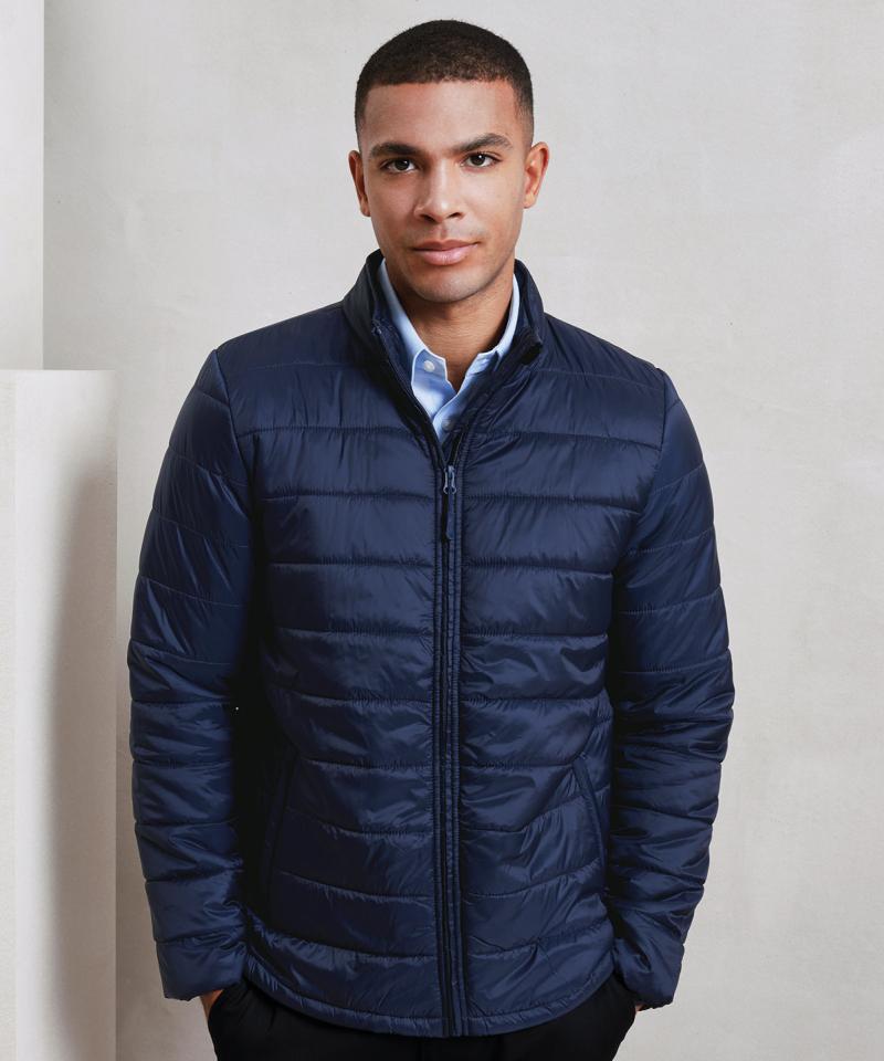 Specification - Mens padded zip-through jacket with horizontal stitching to form baffles, ensuring an even distribution of insulation. Covered zip with chin guard and zip guard to the inner. Styled with a cadet collar. Two welt jet zipped side pockets with a single open pocket to the inner for handy storage. Elasticated cuffs measuring one inch wide. Full embroidery access to the entire jacket through an internal zip in the lining. Lightweight and folds downs easily into its own stuff sack. Made with 100% certified recycled fabrics..