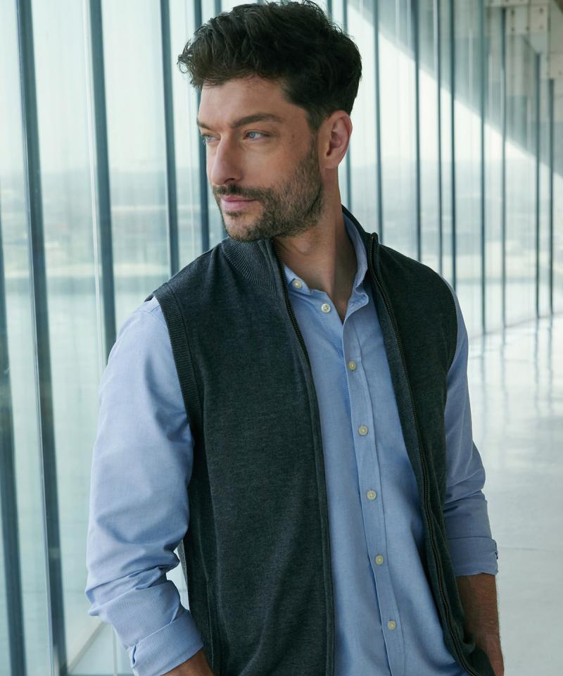 Specification - Mens sleeveless zip-through jumper. Made from 50% cotton/50% acrylic, matching the Henbury knitwear collection. 12 gauge knitwear. Regular fit. Full-length front metal zip with covered placket. Two side welt pockets. Ribbed collar, hemline and armhole. Henbury cut-out label..