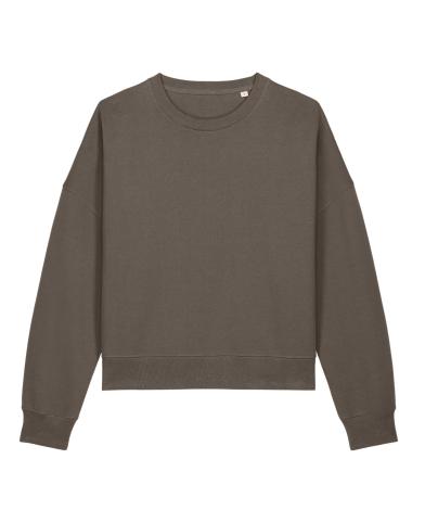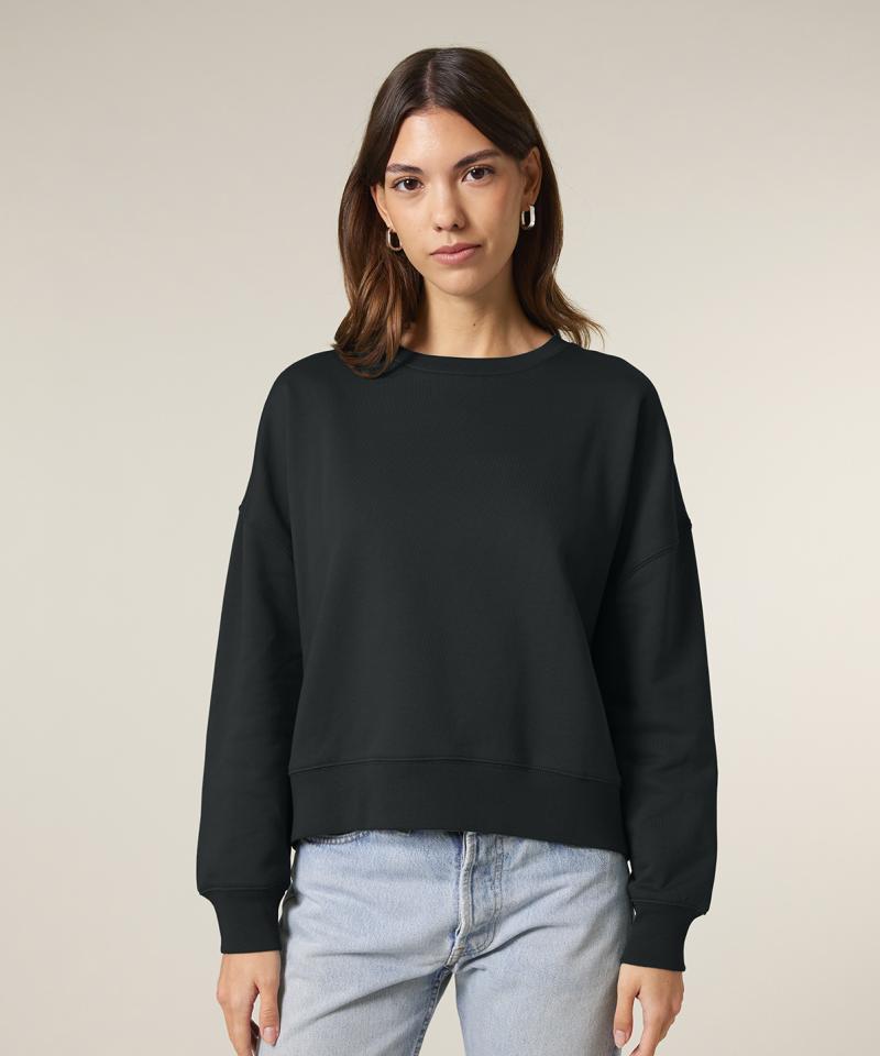 Premium womens crew neck sweatshirt in brushed 100% organic cotton, 300gsm. Dropped shoulders, adjusted length. Broad colour choice. Excellent printability..
