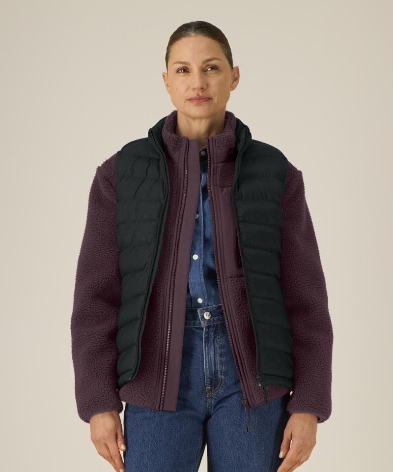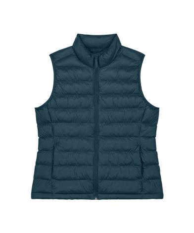 Specification - Womens bodywarmer. Fitted. Sleeveless. High collar. Reverse nylon zip at centre front. Zipped welt pockets with extra grosgrain puller. Elastic tape binding at the armhole. Fully quilted. Side panels for a better shape. Inside seams with binding finish. Bottom hem has an adjustable plastic stopper and elastic cord..