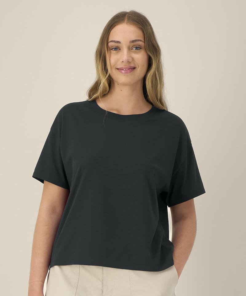 Specification - Womens cotton modal t-shirt. Set-in sleeves. Longer back with curved hem. 1x1 rib at collar. Self-fabric back neck tape. Twin-needle topstitching at sleeve cuffs and hem. Contains 60% OCS-certified organic cotton, certified by Control Union CB-CUC-1393082. Contains 40% Modal (TENCEL)..