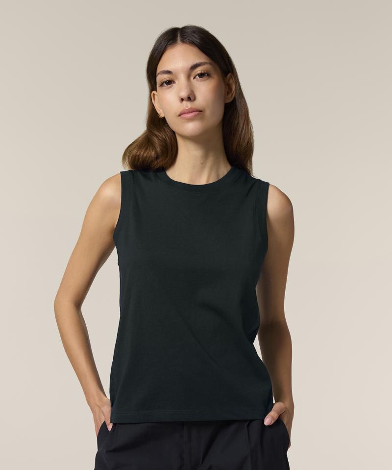 Specification - The Stella Mia tank top for women. Medium fit. Sleeveless. 1x1 rib at collar and armhole. Back neck tape in self-fabric. Twin-needle topstitches at hem..