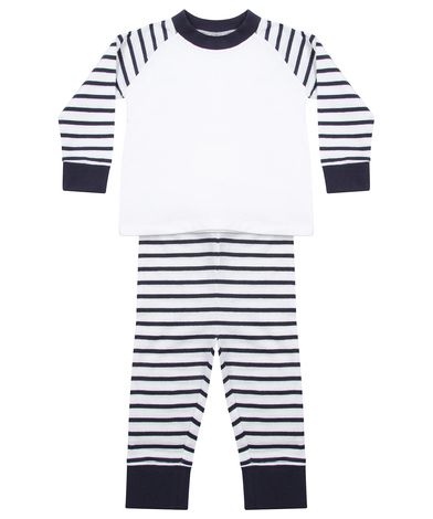 Specification - Striped pyjamas in 100% cotton single Jersey with plain 100% polyester front and back body panels suitable for sublimation printing. Contrast ribbed cuffs. Raglan styling. Bodysuit vest. YKK popper fastening. Bound neck and armholes. Made in soft cotton interlock. Size tab only. SEDEX certified. Oeko-Tex certified. BSCI certified..