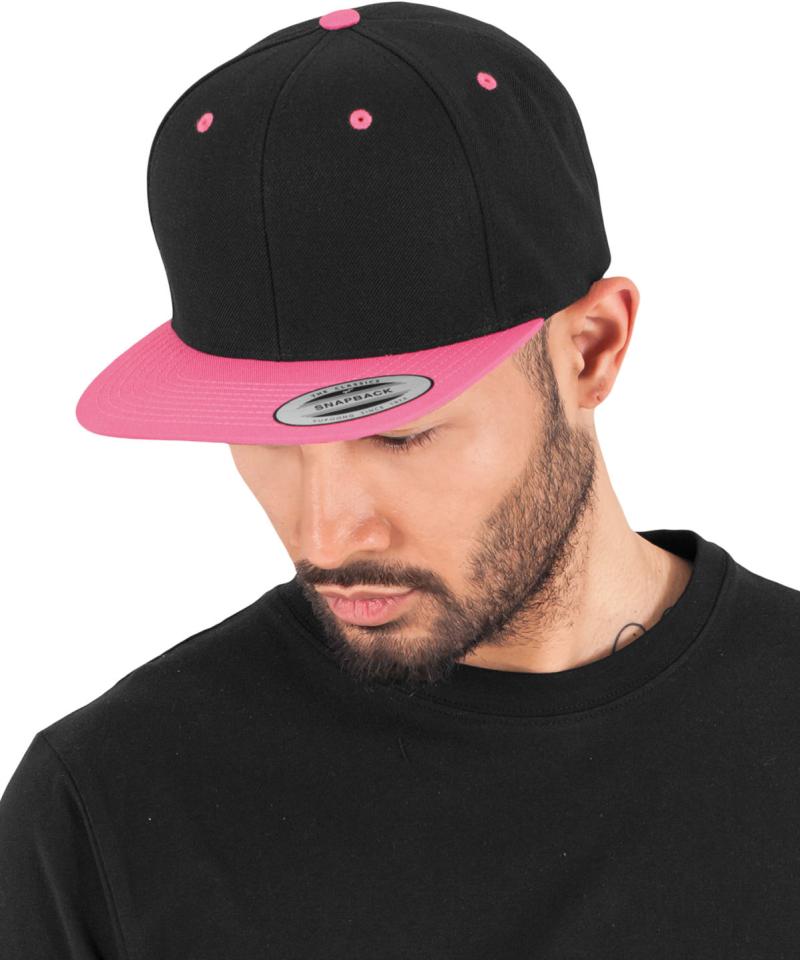 The premium classic snapback with 2-tone peak has the same classic shape but with total coordination in mind. The plastic snap is fully adjustable for a perfect fit..