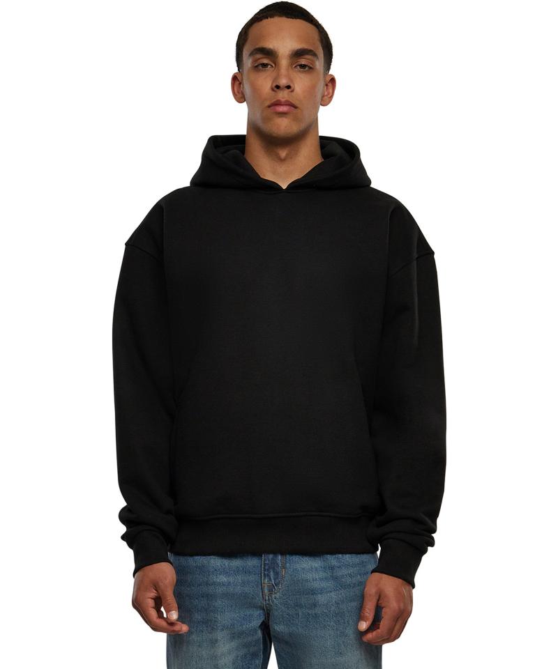 Specification - The men's hoodie features a large hood and wide rib cuffs on the sleeves and hem. The integrated kangaroo pockets add a practical touch. A casual urban fit with dropped shoulders creates a masculine silhouette. The men's hoody is made of smooth and heavy brushed fleece, which can be further refined using flex or screen printing..