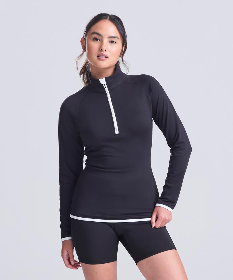 Specification - AWDis' own CoolFit blended fabric containing elastane that provides stretch for comfort and a great fit, girlie fit, reflective tab at back of neck helps keep ear phone cords in place, self-fabric contrast colour binding at zip, cuffs and hem, raglan sleeve design creates ease of movement, 1/2 zip with stand-up collar for warmth, chin guard prevents irritation, simple tear off label makes it perfect for rebranding, UPF 30+ UV protection..