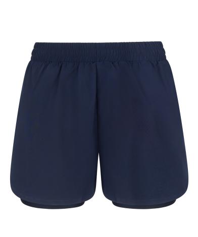 Specification - Womens double-layer sports shorts. Four-way stretch fabric. Undershort made from stretch interlock fabric with wicking properties, and with phone pocket on left-hand side (as worn). High side vents for easy movement. Self-fabric elasticated waistband. Internal drawcords..
