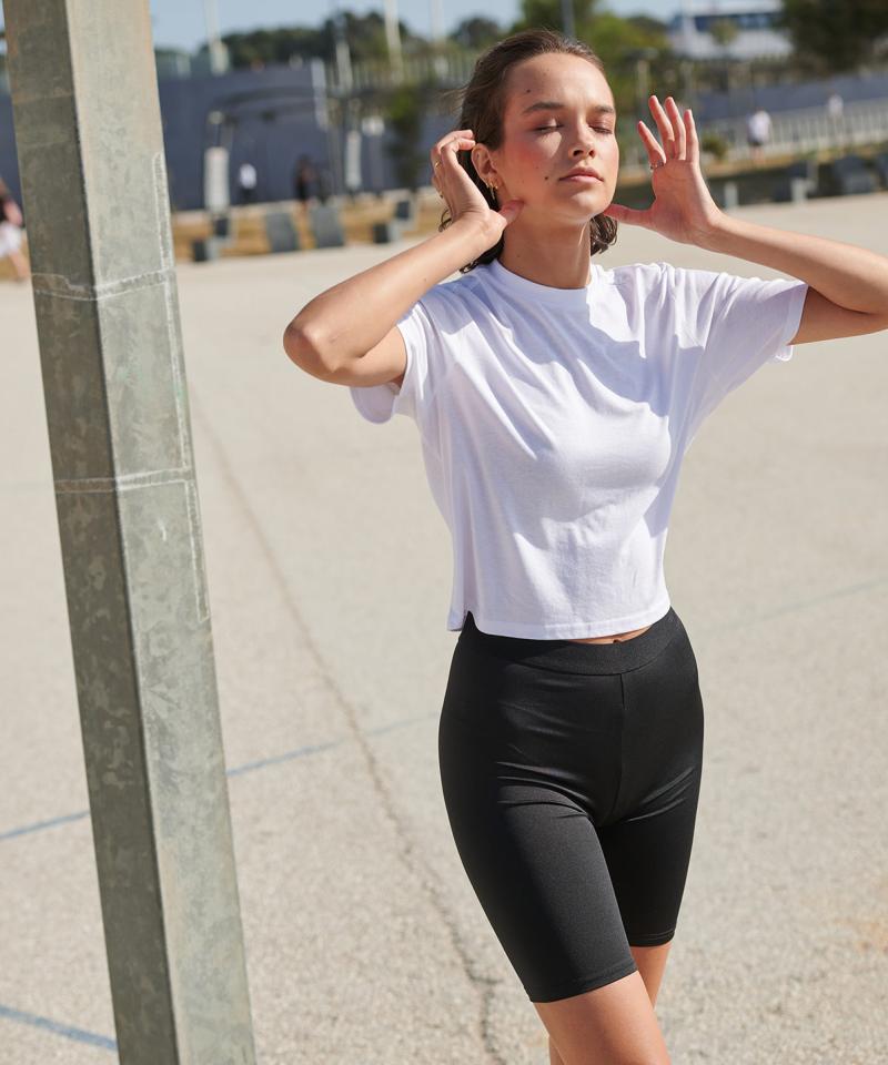Specification - Women's fashion cycling shorts. Soft elastic jacquard waistband, suitable for printing. Non-transparent stretch polyester fabric. Tear-out label for easy re-branding..