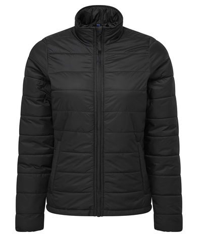 Specification - Womens padded zip-through jacket with horizontal stitching to form baffles, ensuring an even distribution of insulation. Covered zip with chin guard and zip guard to the inner. Styled with a cadet collar. Two welt jet zipped side pockets with a single open pocket to the inner for handy storage. Elasticated cuffs measuring one inch wide. Full embroidery access to the entire jacket through an internal zip in the lining. Lightweight and folds downs easily into its own stuff sack. Made with 100% certified recycled fabrics..