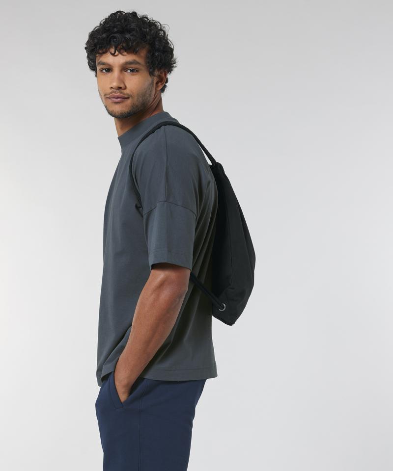 The woven gym bag is cut in premium 300gsm 80% reclaimed cotton, 20% recycled polyester and features clean and reinforced finishes..